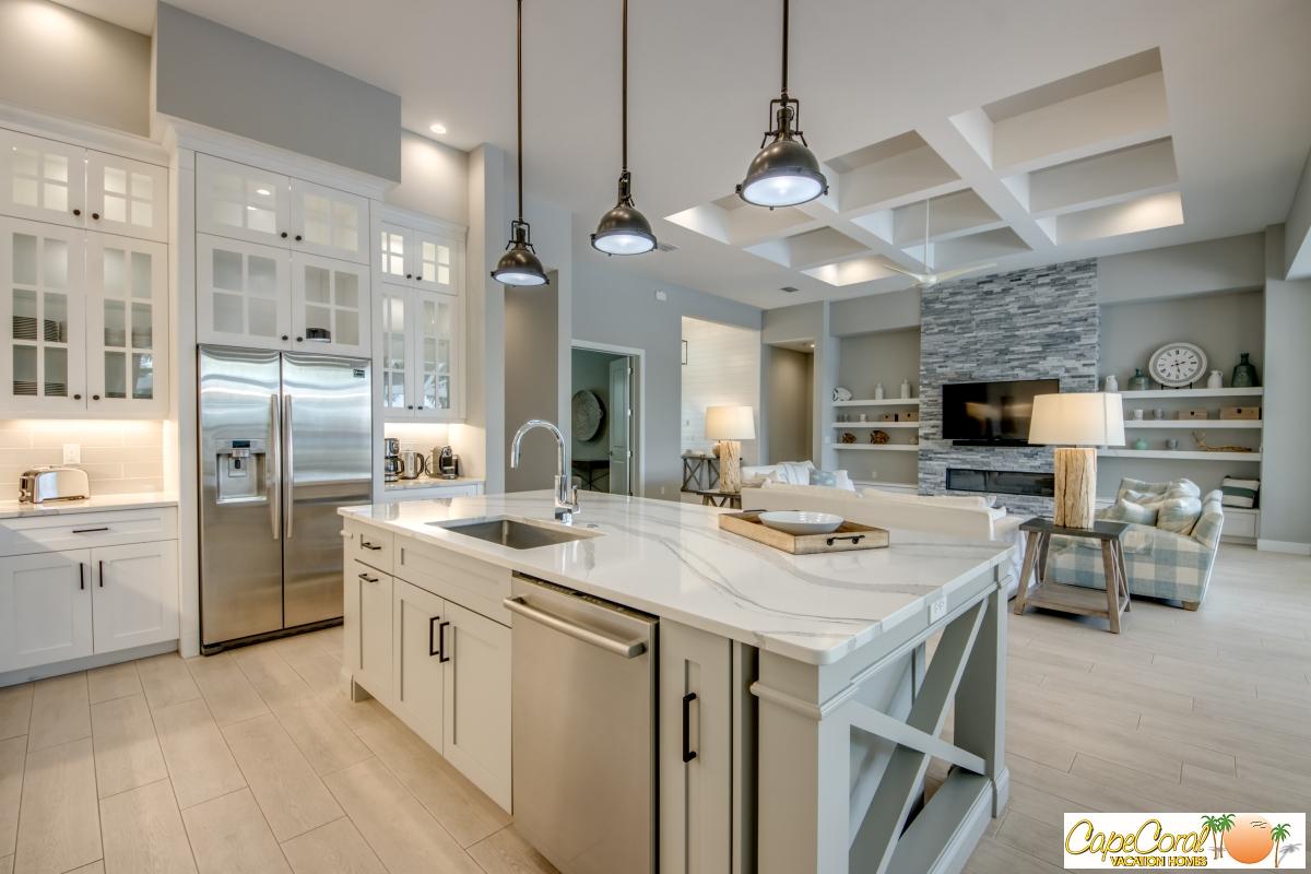 The coastal-style villa offers a spacious, open living area with high ceilings and a fireplace, and the interior in various shades of blue corresponds with the colors of the ocean. The large, floor-to-ceiling sliding glass doors in the living area open completely onto the lanai area. The kitchen with kitchen countertop is equipped with high-quality kitchen appliances and a quartz counter-top. There is a washing machine and dryer in the utility room.